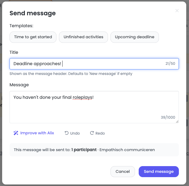 Admins and coaches in TrainTool can send messages to their Trainees. For example, if they have not yet started or completed their modules. To make this process as seamless as possible, we have optimized the messaging flow. As a finishing touch, we’ve added 'Improve with Alix.' This feature allows you to quickly draft a message and let Alix provide suggestions for refinements or tone adjustments.