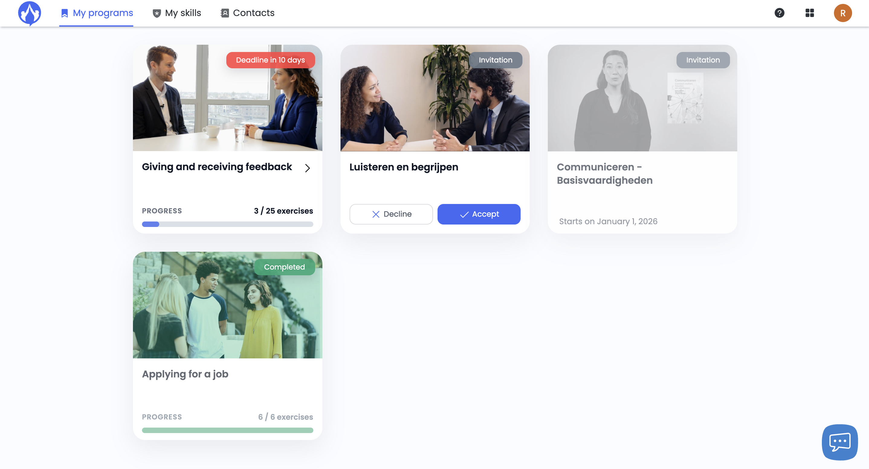 In addition to a more modern design, we’ve ensured that invitations and programs will also appear in this overview going forward. This way, trainees always know exactly where they stand within TrainTool. On the program cards, trainees can now see at a glance how far they’ve progressed, when access to a program becomes available, or what score they achieved on the final assessment.
